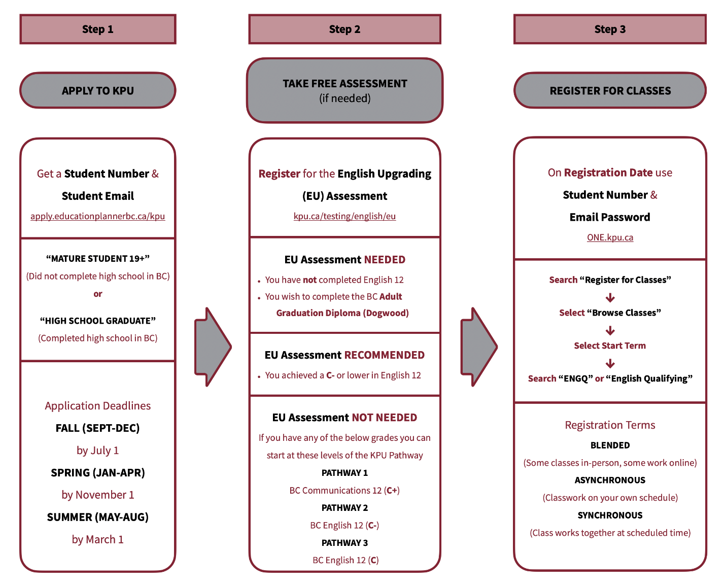 New students—with or without a BC high school diploma—can take English Upgrading (ENGQ) courses by completing three steps: