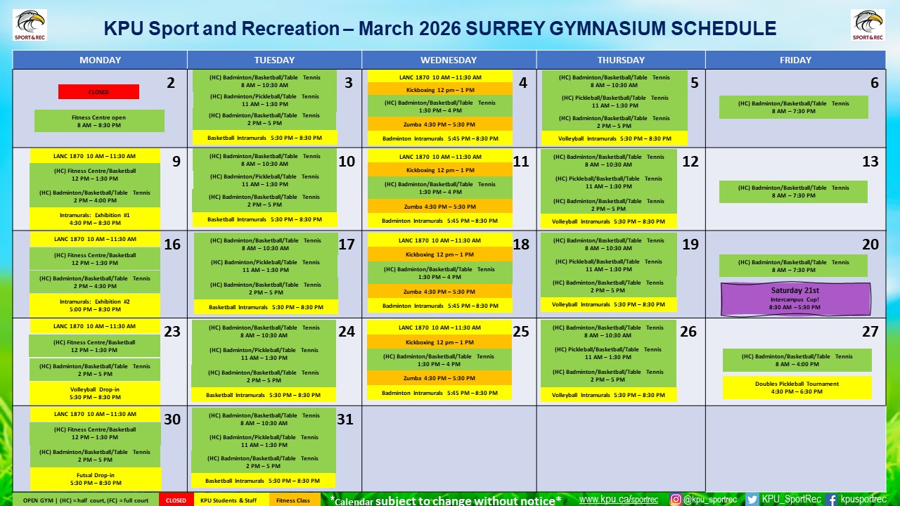- NEW THIS TERM: Online Registration! Visit us at sportrec.kpu.ca to check out the Spring 2026 Intramural and fitness Class schedule!